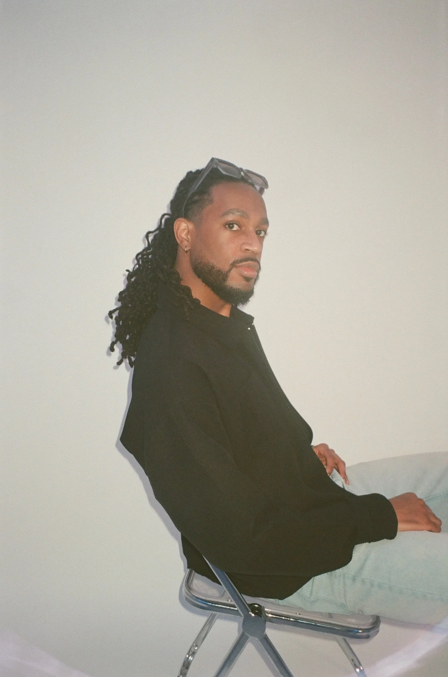 A man with dreadlocks and a beard, wearing a light denim jacket and matching jeans, sitting on a stool with eyes closed, listening to music through large black over-ear headphones.